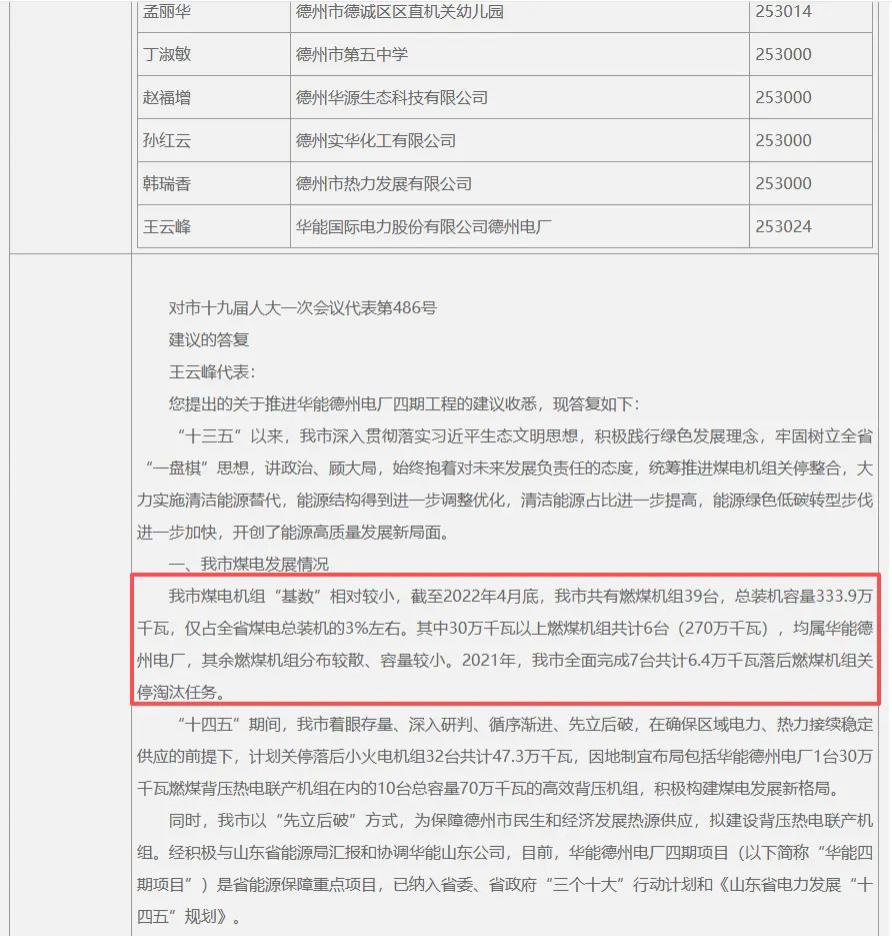 据德州市发改委2022年5月30日给市人大代表王云峰回复的《第486号 关于推进华能德州电厂四期工程的议案转建议的答复》(以下简称《议案建议》)显示,德州市煤电机组"基数"相对较小,截至2022年4月底,全市共有燃煤机组39台(总装机容量333.9万千瓦),仅占全省煤电总装机的3%左右,其中30万千瓦以上燃煤机组共计6台(270万千瓦),均属华能德州电厂(如下图)。