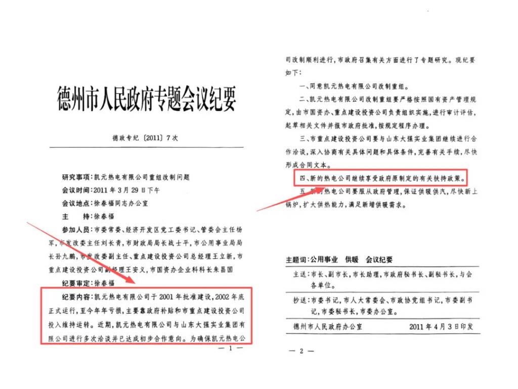 为推动项目顺利落地,德州市政府随后专门就"凯元热电重组改制问题"召开了专题会议,一致同意大强集团收购凯元热电,并形成了上述《政府会议纪要》。会议纪要明确了"新的热电公司继续享受政府原制定的有关扶持政策"(如上图右红框)。