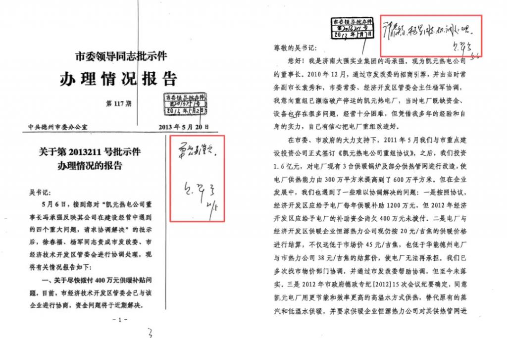 为此,冯承强于2013年5月3日向时任德州市委书记吴翠云递交了一份书面报告,请求凯元热电与外包公司恒源热力执行"同城同价"结算。凯元热电在报告中提到,"电厂与恒源热力现仍按20元/吉焦的供暖价格进行结算,远低于华能德州电厂与市热力公司38元/吉焦的结算价,使电厂无法再承担。我们多次找市物价部门、发改委协调,至今仍未落实。"2013年5月6日,时任德州市委书记吴翠云作出批示,请市政府相关领导协调处理(如下图右红框)。
