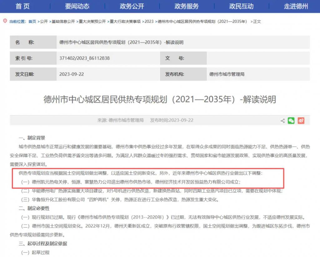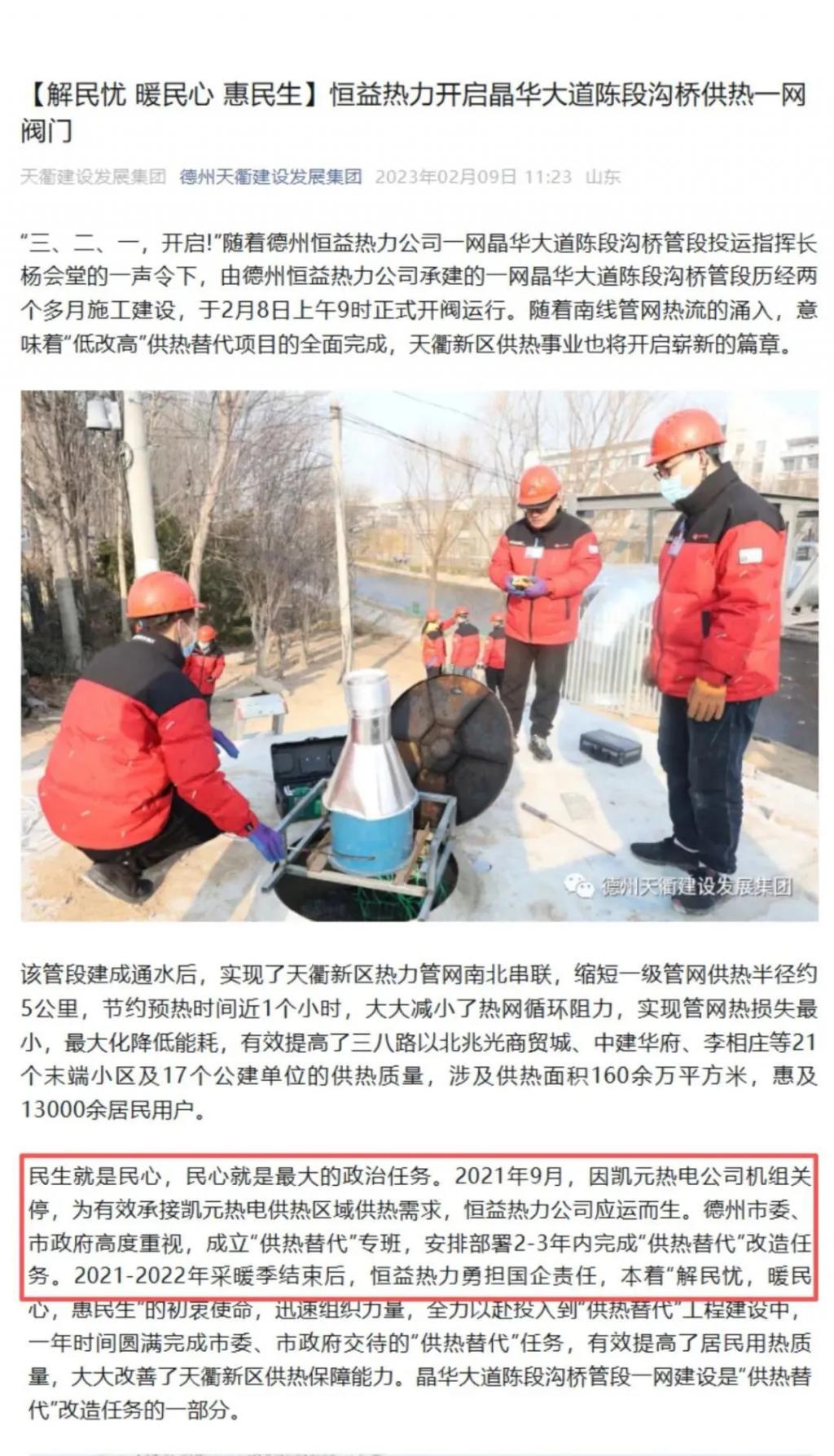 隶属于德州市政府的德州天衢建设发展集团有限公司(以下简称:天衢建设发展集团)官微此前刊发的一篇文章印证了此事:因凯元热电机组关停,为有效承接凯元热电供热区域的供热需求,其子公司恒益热力于2021年9月应运而生。而在恒益热力成立前一个月,德州市政府将凯元热电供热替代项目列为2021年德州市"挂图作战"重点民生项目,并由恒益热力替代原凯元热电供热。