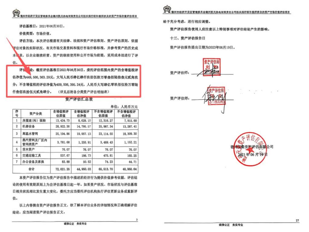 但德州经开区管委会并不认可这个补偿金额,提出了双方共同选定一家评估机构重新评估。2023年6月19日,德州天衢资产评估有限公司接受双方委托,对凯元热电所持有的房屋建筑物、机器设备、高温水管网、蒸汽管网、苗木、交通办公设备等资产进行市场价值评估,结果显示总补偿费为4.495亿余元(含增值税,如下图)。据了解,应凯元热电要求,该评估报告未将凯元热电土地使用权列入补偿范围。