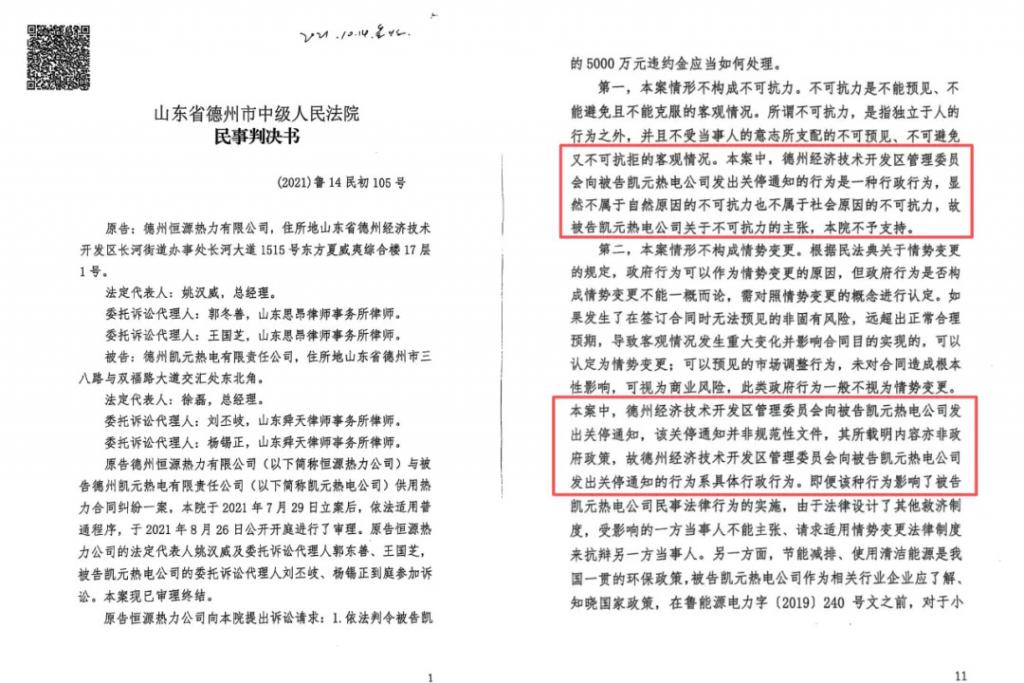 而德州经开区管委会之前作出"关停通知"的依据是国家和省里的政策要求。但有意思的是,德州市中级人民法院却在随后的凯元热电一起民事诉讼案中认定此"关停通知"不构成不可抗力,属于当地政府行政行为。这意味着此次关停不属于政策性关停。