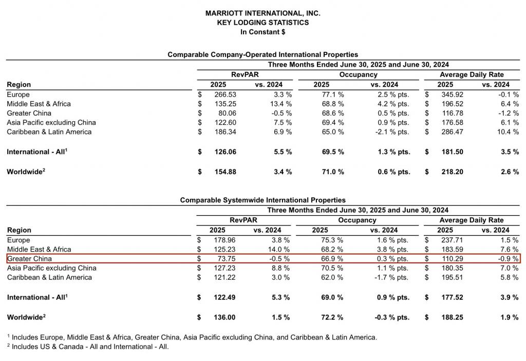 如反映酒店运营质量的核心指标 RevPAR(平均客房收益)一项,在万豪国际全球各区域间,二季度仅大中华区录得 0.5% 的同比下滑。与此同时中东和非洲地区 RevPAR 同比增幅最高,为 14%;除中国外的亚太地区 RevPAR 同比增长 8.8%;欧洲地区、加勒比和拉丁美洲地区 RevPAR 分别同比增长 3.8%、3%。