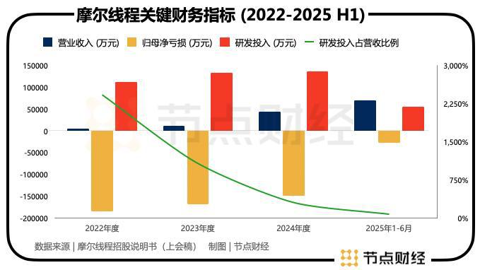 另一方面,2022 年至 2024 年,摩尔线程累计归母净亏损接近 50 亿元人民币,亏损的根源直指其巨额的研发投入,三年半的时间里,研发总费用高达 43.66 亿元。但将研发投入与营收的比例并列观察,一条陡峭的下降曲线清晰可见,从惊人的 2422% 骤降至 79%。