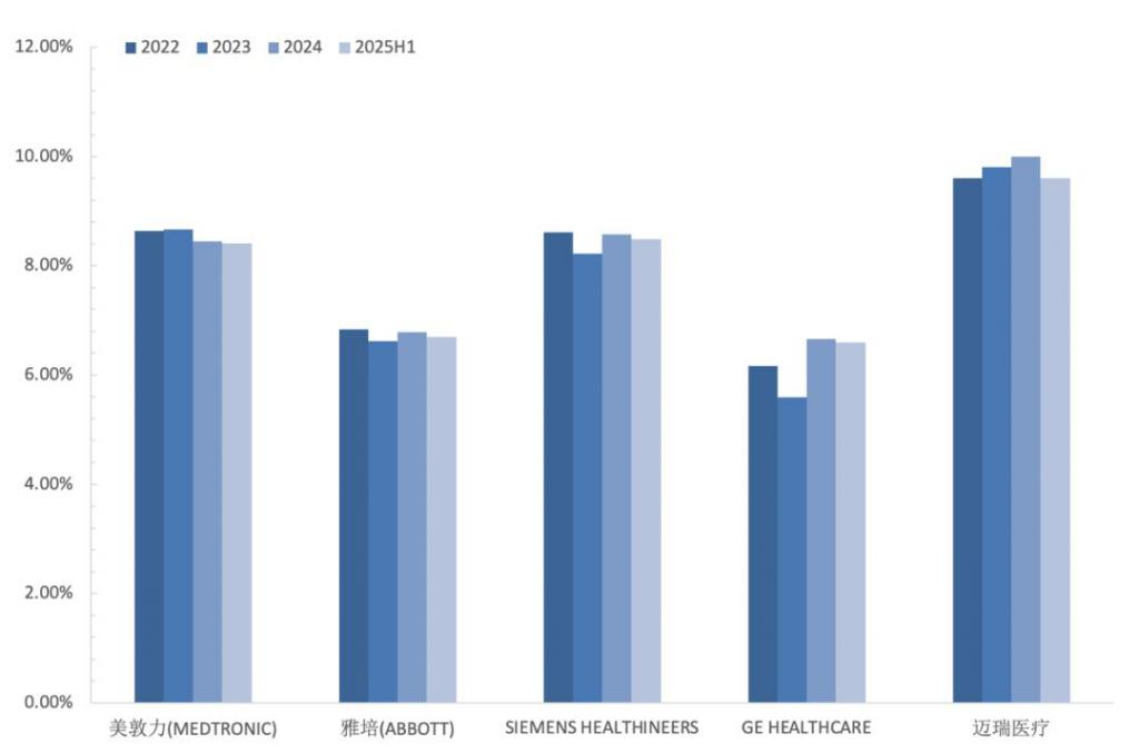 在研发方面,迈瑞保持了较高的研发强度,长期的研发费用率在 9~10% 区间。而且,长期的研发费用同比增速与收入增长相匹配;即便 2025 上半年的研发费用出现了一定的同比下滑,但下滑程度远低于收入端,研发费用率因此依然保持稳定。