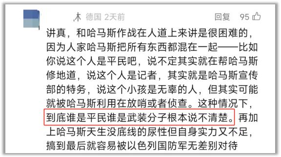 而且,“考虑到加沙有很多伪装成平民的哈马斯特务,实际上遇难的平民可能并没有那么多”。