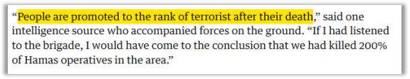 用某位以色列情报人员的话来说,这些无辜的死难平民还可能被军方贴上子虚乌有的政治标签,然后被算进哈马斯阵亡人员的名单。