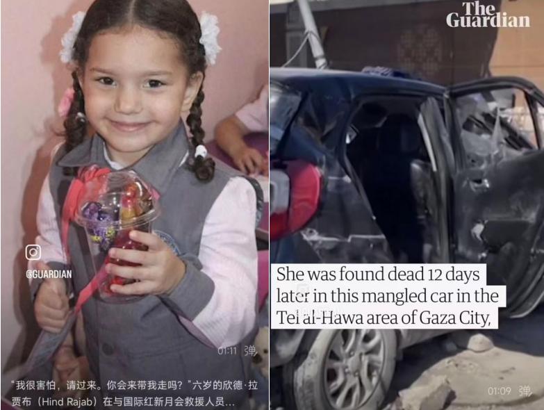 (加沙小女孩欣德 · 拉贾布与家人一起在轿车中遇难,他们的车上有 335 个弹孔。)