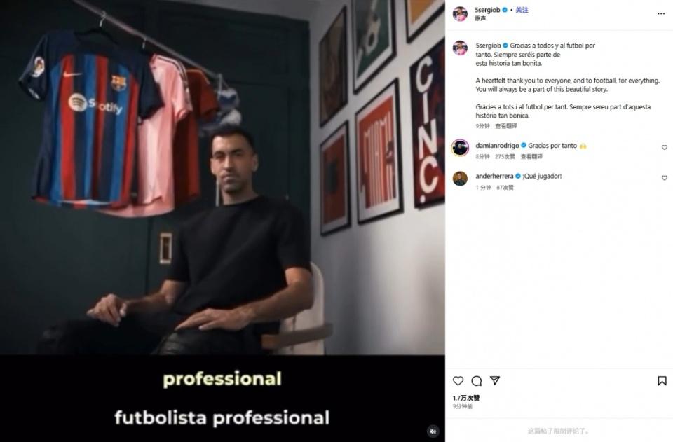 布斯克茨在社媒动情写道:" 衷心感谢大家,感谢足球带来的一切。你们永远都是这段美好故事的一部分。"