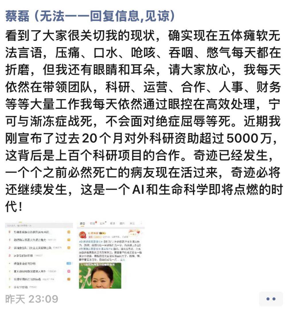蔡磊朋友圈详细说道:" 看到大家很关切我的现状,确实现在肢体瘫软无法言语,压痛、口水、呛咳、吞咽、憋气每天都在折磨我,但我还有眼睛和耳朵,请大家放心,我每天依然在带领团队,科研、运营、合作、人事、财务等大量工作我每天依然通过眼控在高效处理。宁可与渐冻症战死,也不会面对绝症屈辱等死。近期我刚宣布了过去 20 个月对外科研资助超过 5000 万,这背后是上百个科研项目的合作。奇迹已经发生,一个个之前必然死亡的病友现在活过来,奇迹必将继续发生,这是一个 AI 和生命科学即将点燃的时代!"