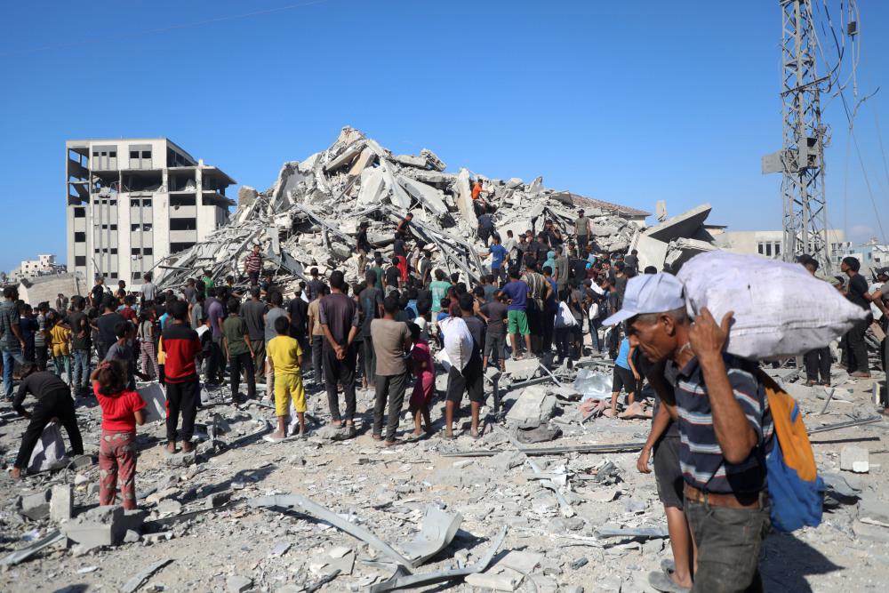2025 年 9 月 8 日,人们在加沙城查看一座高层建筑遭以色列军队空袭后的废墟。新华社发(里泽克 · 阿卜杜勒贾瓦德摄)