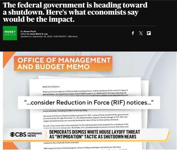 在此次预算危机中,特朗普更是发布备忘录,要求各联邦机构为停摆准备 " 永久性裁员计划 "(Reduction In Force,RIF),将以往停摆中的临时休假转化为永久性岗位裁撤。