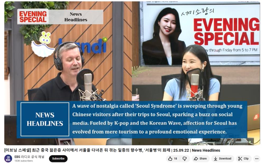 韩国教育广播公司 EBS 在一档名为《Evening Special》的节目中,用英文向全世界宣传," 首尔病 " 在中国各地蔓延,中国游客从首尔旅游回来后,在韩国流行音乐和韩流文化的推动下,对韩国的喜爱已经从普通旅游进化成为深入的情感体验,并称 " 首尔病 " 一词已经成为了中文互联网的热搜。末了,两位主持人在节目结尾处还不忘 " 提醒 ",大量涌入的中国游客可能会产生不文明的行为,这让人担心会对当地的居民产生何种影响。
