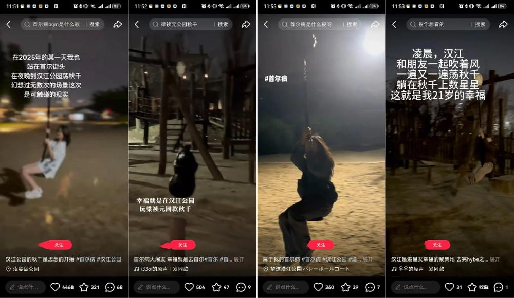" 首尔病 " 真正的走红起始于一个荡秋千的短视频,创作者上传了自己在韩国首尔汉江公园玩索道秋千的视频,配有非常感伤的背景音乐并打上了 " 首尔病 " 的标签。