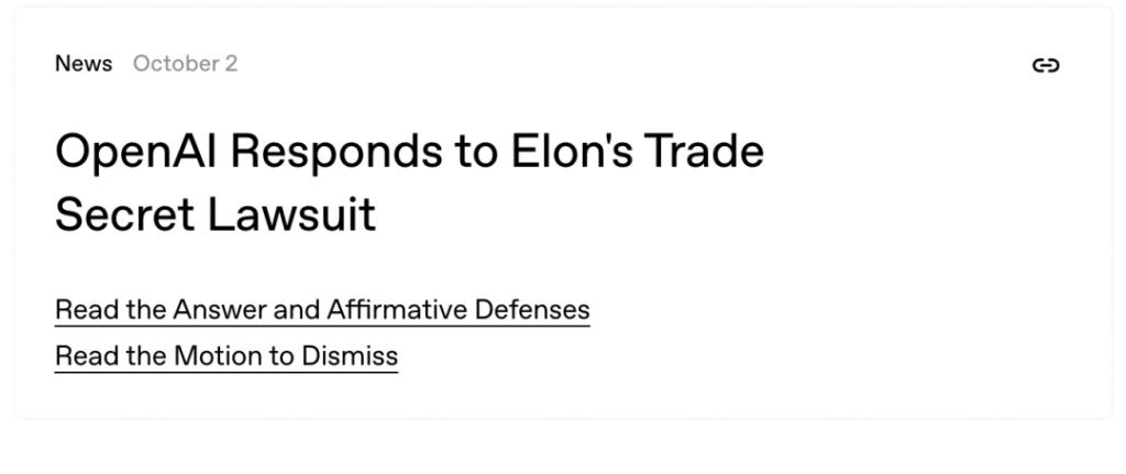北京时间 10 月 3 日上午,OpenAI 通过官方新闻账号对马斯克最新以诉讼为幌子的骚扰策略作出回应。OpenAI 表示,不需要也不想要任何人的商业机密。OpenAI 将保护员工,不会被马斯克试图欺凌他们的行为所吓倒。