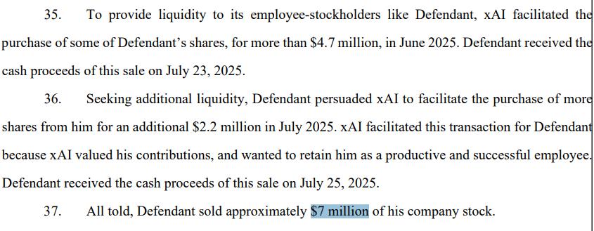 因为岗位关键,xAI 给予了 Li 极大的信任。他不仅被授予了访问公司整个技术栈组件的权限,还能访问部分机密文件和专用信息。作为对核心人才的认可,xAI 还为 Li 提供了期权和股份。今年 6 月和 7 月,xAI 协助 Li 出售了他持有的公司股份,累计套现近 700 万美元。