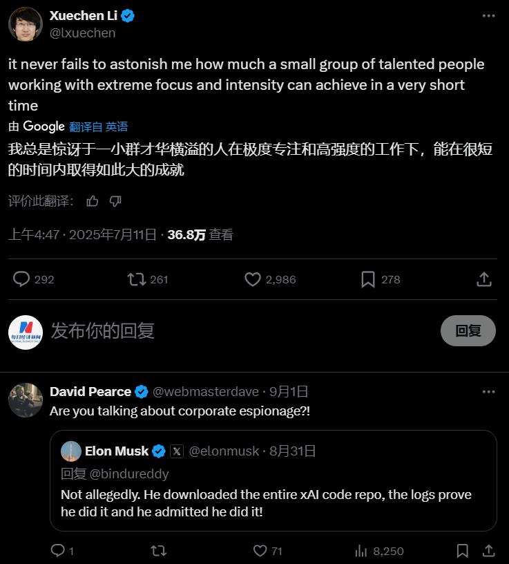 而在这条贴文的下方,马斯克于 8 月 31 日跟了一条评论,"他下载了整个 xAI 的代码库,日志证明他确实下载了,而且他自己也承认了!"