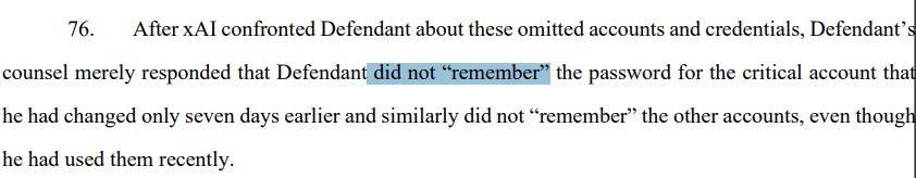当 xAI 就此当面质问时,Li 的律师给出了令人难以置信的答复:Li" 不记得 " 密码。要知道,关键账户的密码是 7 天前他才改过的。