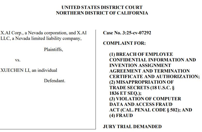 8 月 28 日,xAI 以窃取商业机密的名义将 Li 告上加州北区联邦法院。起诉书显示,xAI 对 Li 进行了多项指控,分别是违反《员工保密信息与发明转让协议》《离职证明与授权书》,盗取商业机密,违反《计算机数据与访问欺诈法》和欺诈。