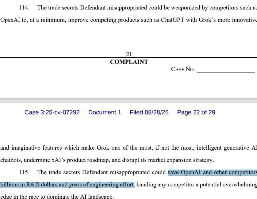 起诉书称,被盗用的商业机密可以为 OpenAI 和其他竞争对手 "节省数十亿美元的研发费用和多年的工程努力",从而获得 " 潜在的、不可逾越的竞争优势 "。OpenAI 等公司可以利用 xAI 的机密信息改进 ChatGPT 等产品,融入 Grok 更具创新性和想象力的功能。
