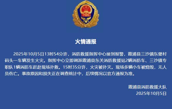 10 月 5 日 23:49,福建省宁德市霞浦县消防救援大队发布火情通报称,当天 13 时 54 分许,消防救援指挥中心接到报警,霞浦县三沙镇东壁村码头一车辆发生火灾。指挥中心立即调派霞浦县东关消防救援站 2 辆消防车、三沙镇专职队 1 辆消防车赶赴现场扑救。15 时 35 分许,火灾被扑灭。现场多辆小车被烧毁,无人员伤亡。事故原因和损失正在调查统计中,后续情况以官方通报为准。