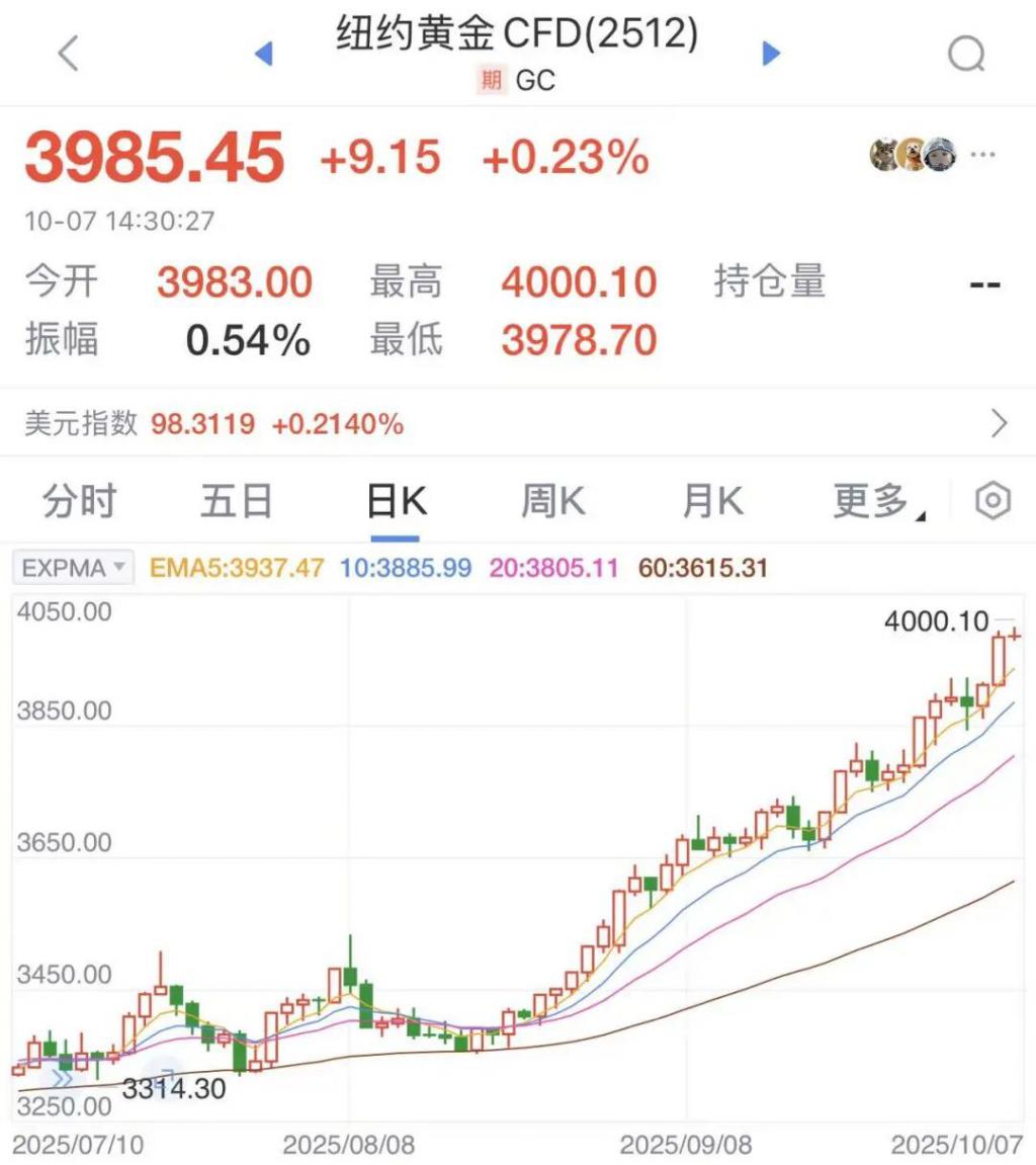 今年以来,黄金价格暴涨,截至发稿,纽约黄金期货报 3985.45 美元 / 盎司,盘中一度突破 4000 美元 / 盎司,年内涨幅已达 50%。