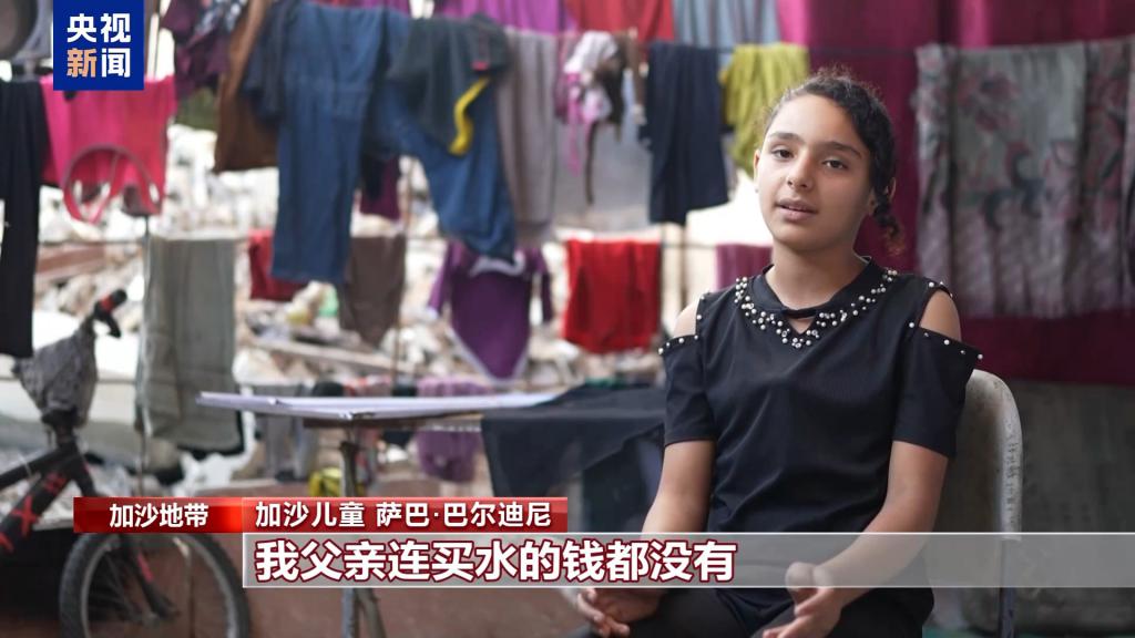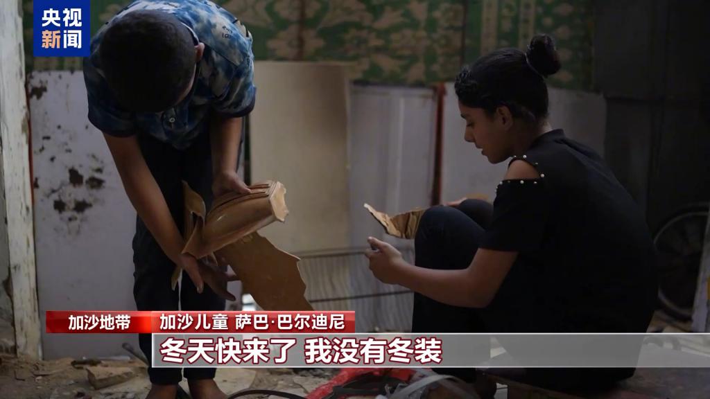 加沙儿童 萨巴 · 巴尔迪尼:我们想暖和一下都做不到,因为没有毯子可以盖。过去我有自己的衣服,现在只能穿妈妈的衣服。冬天快来了,我没有冬装,就连我妈妈也只剩下两套睡衣,我们只能轮流换着穿。我们真的没有衣服了。