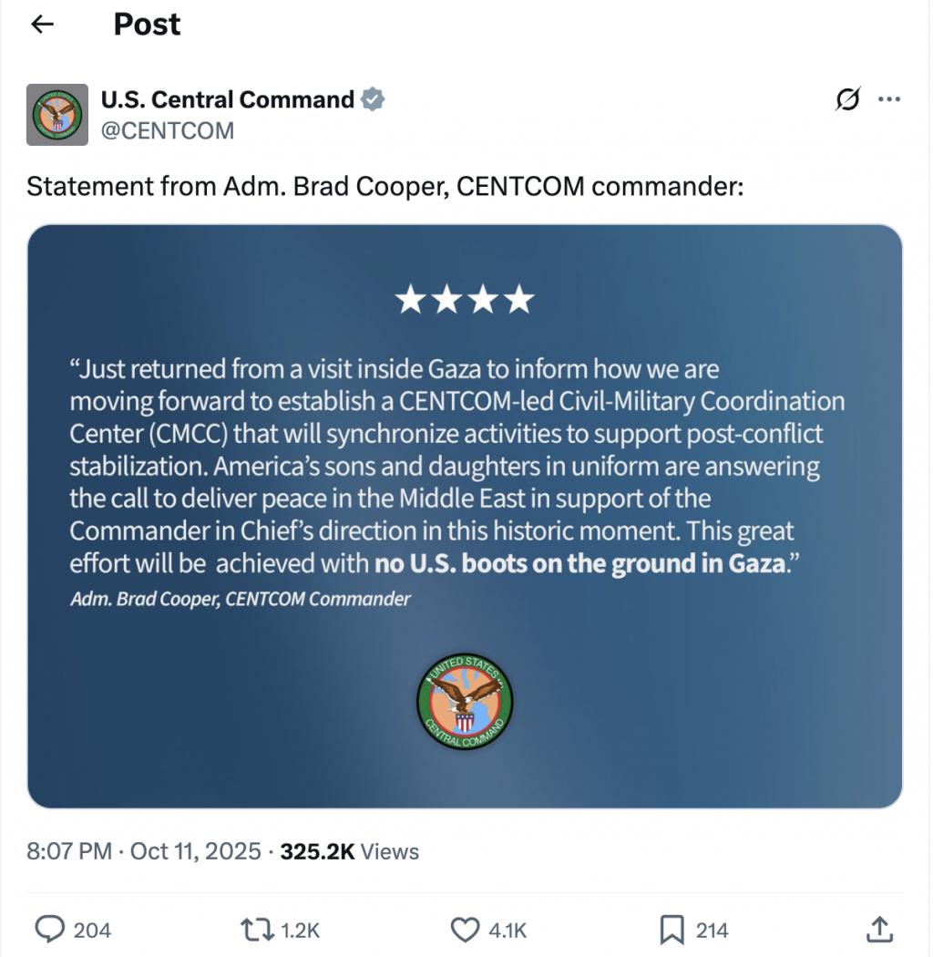 库珀当天在社交媒体上写道,他 " 刚从加沙返回 ",美方计划组建一个由军事和非军事人员组成的 " 协调中心 ",由美军中央司令部主导,为 " 冲突结束后的维稳行动 " 提供支持。