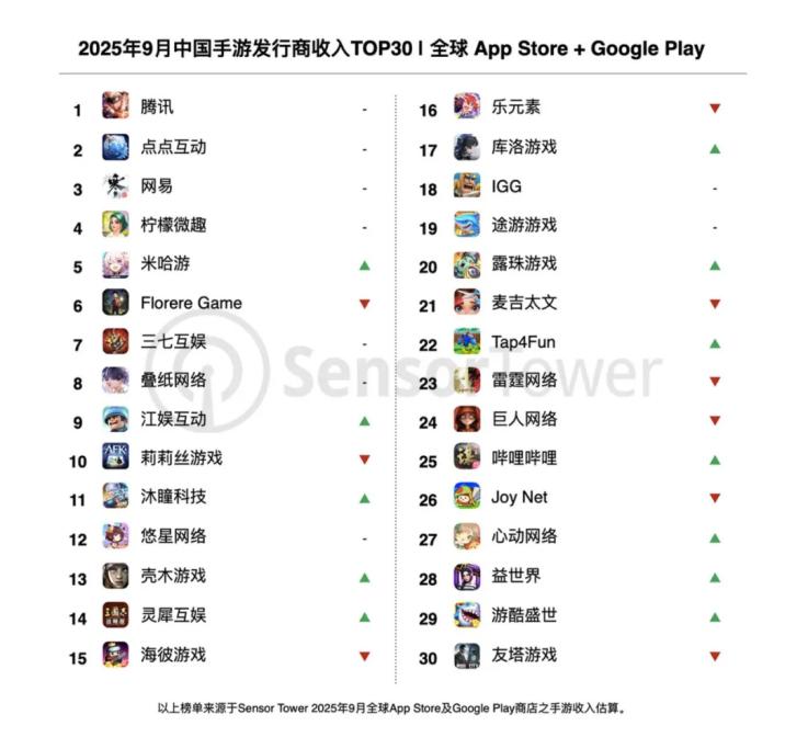 Sensor Tower 的数据显示,2025 年 9 月中国手游发行商全球收入总榜,腾讯、点点互动、网易位居排行榜前三,呈现三足鼎立之势。