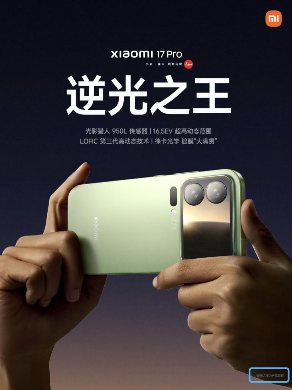 小米手机海报上," 逆光之王 " 四个大字居于正中,而海报的右下角暗处则有小字标注:* 逆光之王为产品目标