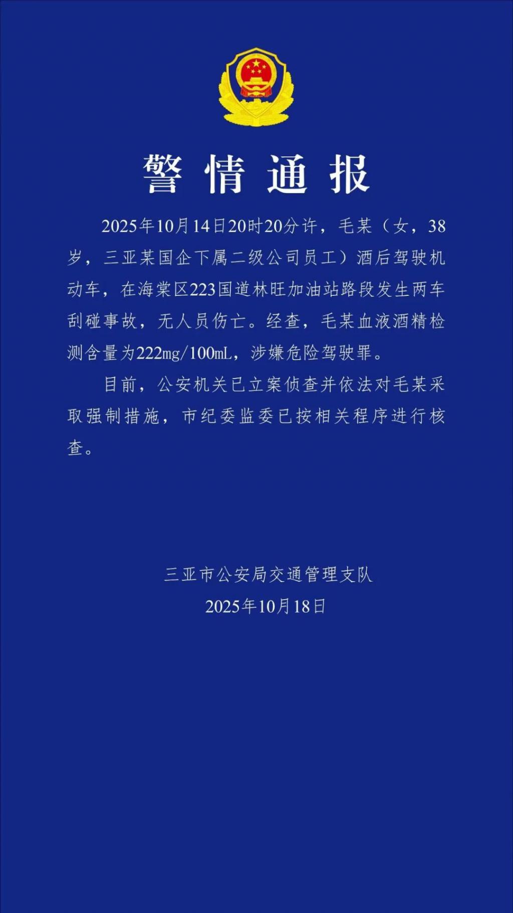 2025 年 10 月 14 日 20 时 20 分许,毛某 ( 女,38 岁,三亚某国企下属二级公司员工 ) 酒后驾驶机动车,在海棠区 223 国道林旺加油站路段发生两车刮碰事故,无人员伤亡。经查,毛某血液酒精检测含量为 222mg/100mL,涉嫌危险驾驶罪。