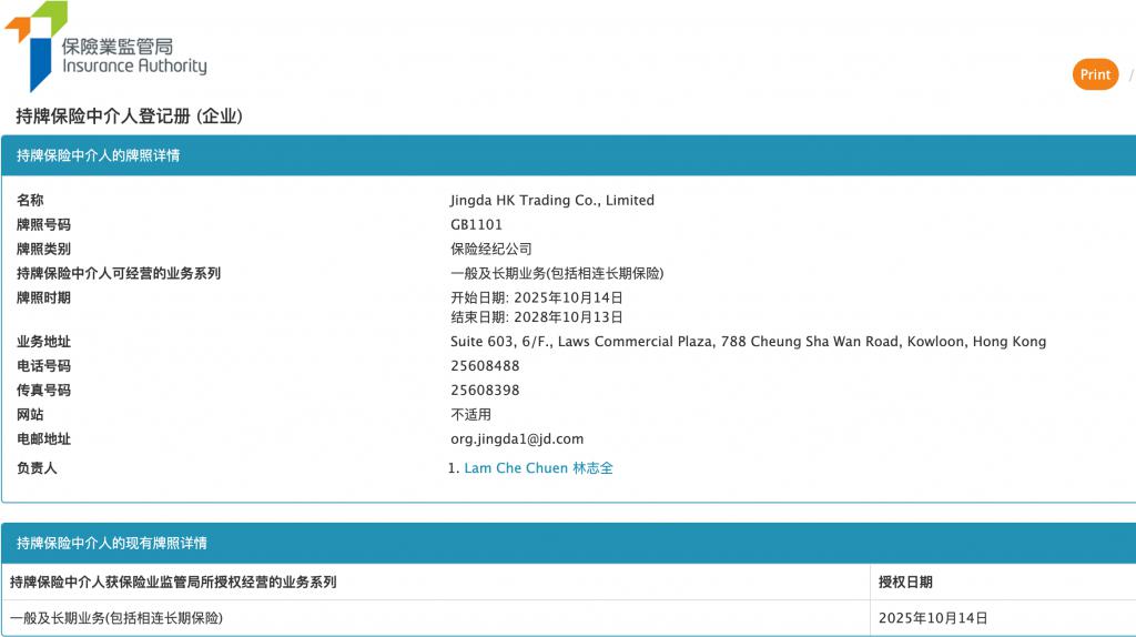 蓝鲸新闻 10 月 23 日讯(记者 李丹萍 陈晓娟)香港保监局网站显示,一家名为 Jingda HK Trading Co., Limited(已于近期更名为 " 京东保险顾问(香港)有限公司 ")的机构,已经拿到保险经纪牌照,业务范围包括一般及长期业务 ( 包括相连长期保险 ) 。牌照时期开始日期为 2025 年 10 月 14 日,结束日期为 2028 年 10 月 13 日。该公司由京东旗下的京东创新资讯科技有限公司持股。
