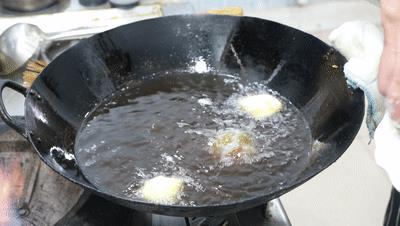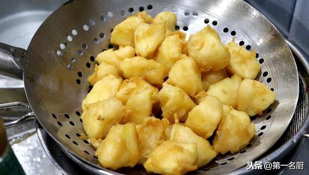 把苹果全部下完以后,再上火继续炸,炸至苹果外皮的面糊呈微黄色时捞出,再用漏勺捞出漂浮的淀粉疙瘩。