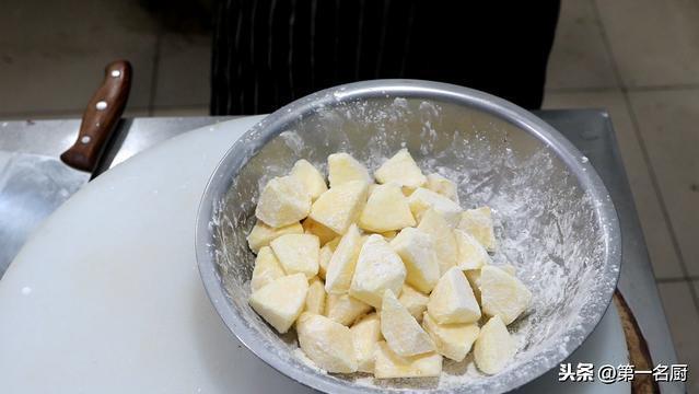 然后撒上少许干淀粉,颠盆拌匀,尽量使每一块苹果都裹上干淀粉。