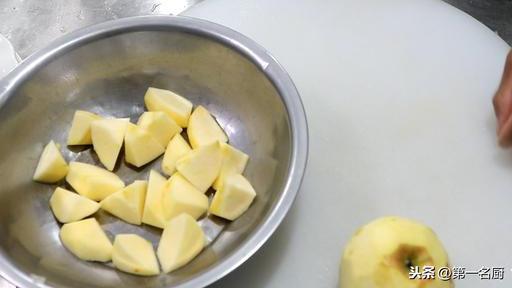 准备洗净的苹果两个,先削去外皮,再切成滚刀块,放入盆中。