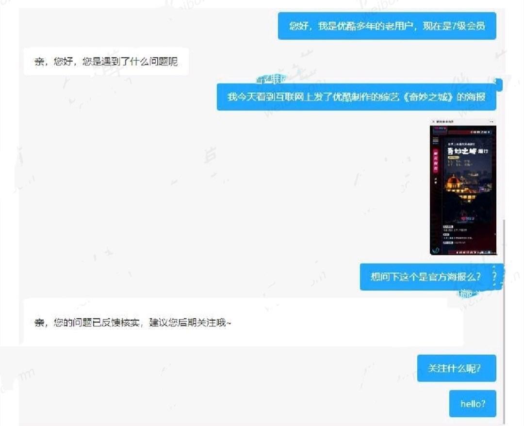 他用首先表示了,七级会员的老用户地位,然后向优酷客服质疑海报的真实性。却遭到了客服的极度敷衍,并且客服选择了不再回复。看到这里,他一定崩溃。但是客服的操作,确实值得点赞。