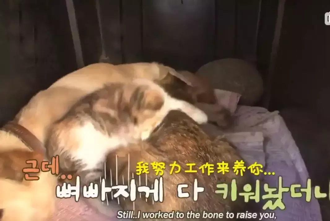 不过,同样是狗妈无私照顾猫宝,但在另一家,这个事就变得有点搞笑了: