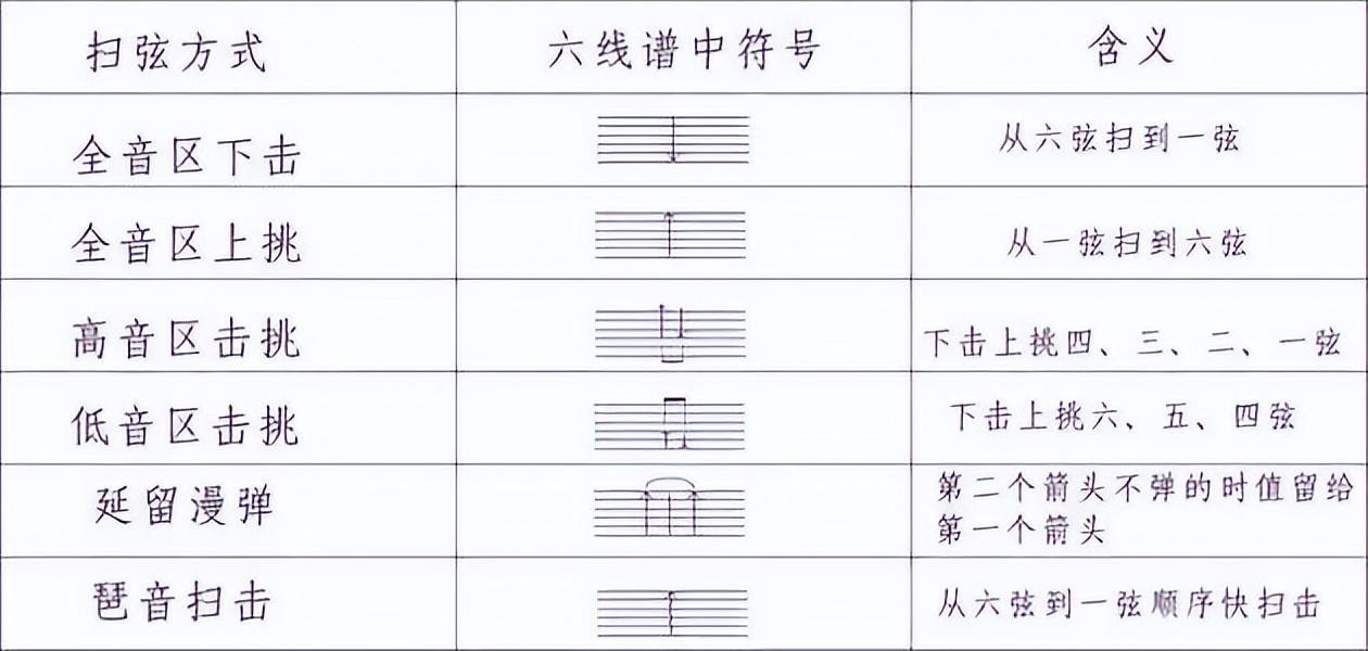 在吉他弹奏中,有几种常见的扫弦方式,如全扫、上下扫、拨片扫等。不同的扫弦方式会带来不同的音效,可以根据乐曲的需要选择适合的扫弦方式。