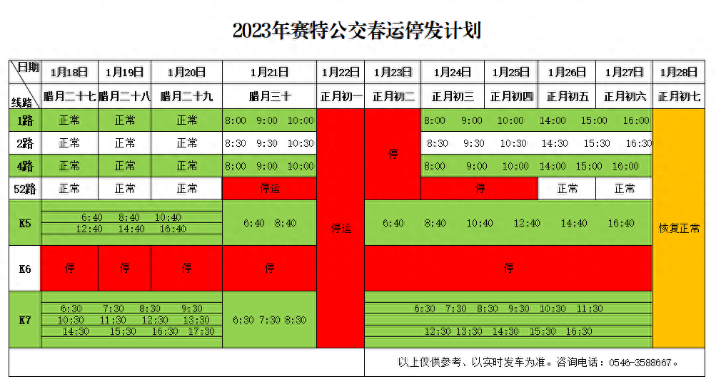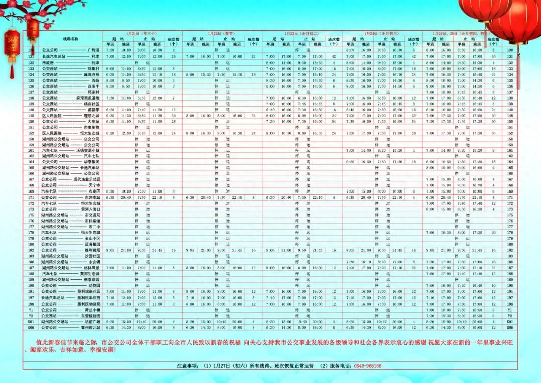 1月21日(除夕)、1月22日(初一)河口城区、城乡、城际公交车放假停运;1月23日(初二)至1月27日(初六)调整发车;1月28日(初七)所有班次恢复正常。