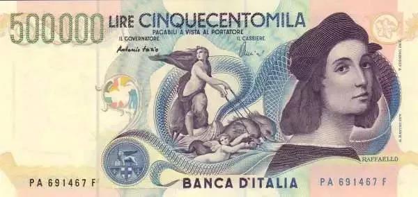 50万意大利里拉由于20世纪50年代之前的几次货币贬值,意大利从60年代末开始发行了5万和10万里拉,1997年又发行了50万里拉。50万里拉的正面是拉斐尔 的自画像和他的作品《嘉拉提亚的凯旋》,背面是拉斐尔于1509年为梵蒂冈签名大厅制作的巨幅壁画《雅典学派》。
