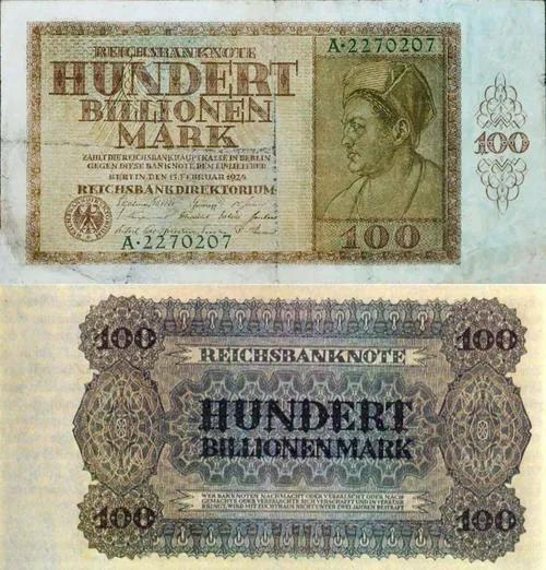 1922年,一条面包的价格是163马克。到1923年9月,在通货膨胀期间,面包的价格一路攀升到150万马克,在恶性通货膨胀的高峰时期,即1923年11月,一条面包的价格竟然高达200亿,1923年,德国政府发行了面值100万亿的马克纸币。