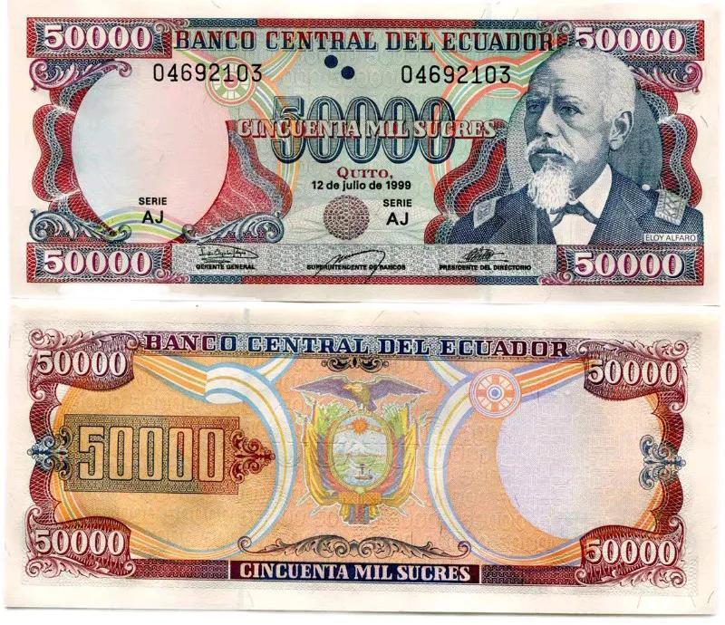 50000元苏克雷纸币,1999年间,厄瓜多尔苏克雷与美元兑换率贬值67%,在2000年1月7日时达到1美元兑25000苏克雷。两天后,总统 哈米尔·马瓦德宣布厄瓜多尔将采用美元作为官方流通货币。