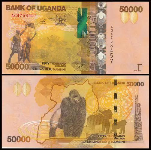 乌干达先令纸币面值有5、10、20、50、100、200、500、 1000、以及50000先令