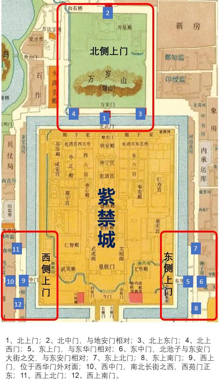 不过大清还干了比开皇城门更狠的事,就是拆上门,上门很多人都不知道,这大明时紫禁城外呀还有个内皇城,有12个上门(清人撰写的《明会要》中记载:“皇城内宫城外十二门。十二门者,北面四门,曰北上门、北上东门、北上西门、北中门;东面四门,曰东上门、东上南门、东上北门、东中门;西面四门,曰西上门、西上北门、西上南门、西中门……”),这12上门当时都有重兵把守着紫禁城的安全。大清一上来把这个东西两侧的8个上门都给拆了,只留了北边的4个门,不过到了清末的时候这4个上门的门也都不关了,所以很多外国摄影师也拍了景山前街和神武门的照片。