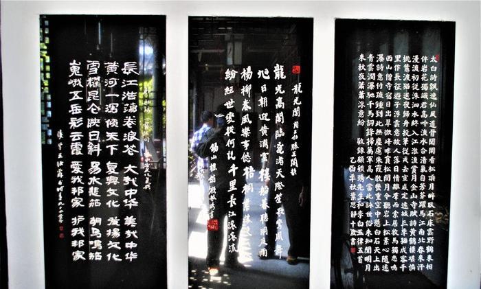 墙上是顾毓琇和李白五律诗,清气自芳芬,跃马江南北。春来汗漫流,初从洙泗水,终入江淮流。赏月金山寺,赋诗黄鹤楼。堪怜桃叶渡,犹送夜归舟。投笔从戎去,宣威定远城。还有一首落款是锡山樵翁顾毓琇书,龙光高阁临鼋渚,天际笙歌鸾凤舞。旭日朝迎黄浦云,楼船暮听洞庭雨。还有一首长江浩荡卷浪苍,大哉中华,美哉中华。等等。他一生创作诗词7000多首,是世界诗人大会加冕的“桂冠诗人”。