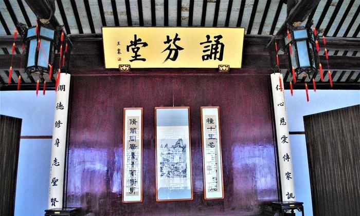 顾毓琇的母亲叫做王镜苏,她的字叫做诵芬,所以这个堂改名诵芬堂。匾额下面对联写的是,仁心慈爱传家训,明德修身志圣贤。里面一幅对联写的是,种十里名花何如种德,修万间广厦不若修身。诵芬堂三个字是王震题写的。顾毓琇1916年考入清华大学之前,就是在诵芬堂度过了美好的青少年时期。诵芬堂规模较大,白墙黛瓦,周围有薛福成,钱钟书,王禹卿,华绎之等人的故居。顾鸿逵居惟善堂,大弟顾汾携四子居燕誉
