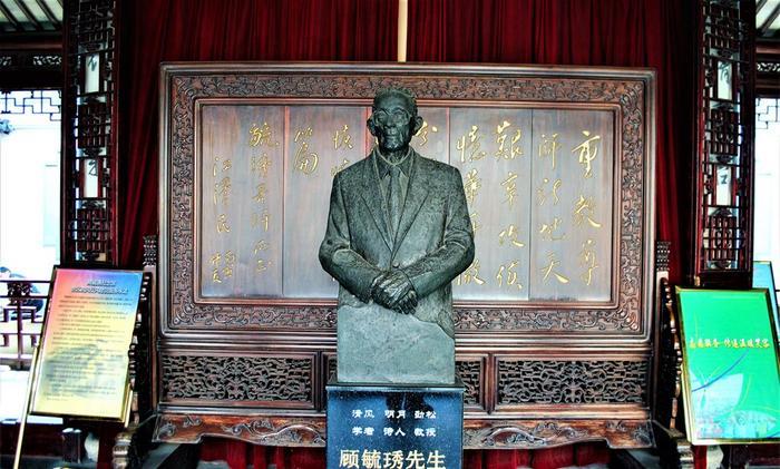 重教尊师新天地,艰辛攻读忆华年。这是顾毓琇纪念馆门口的一副对联。顾毓琇纪念馆,前身是顾毓琇故居,2004年10月改建。走进顾毓琇纪念馆,迎面看到的,就是顾毓琇先生的半身像,戴着眼镜,穿着西装,打着领带,石像下面还有些字,清风,明月,劲松,学者,诗人,教授。12个字,写出了顾毓琇先生的品格,还有他生前的身份。顾毓琇出生于1902年,逝世于2002年,是一位百岁老人。后面影壁上还有
