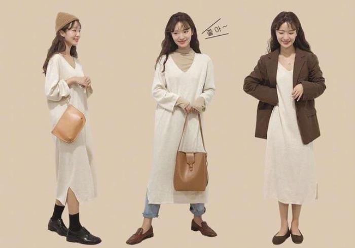 ↑你的衣橱里有这样的白色毛衣裙吗?长长的款式,V领设计,没有修身腰线。这样的单品最适合叠穿了。左边是单穿毛衣裙,最为基本的穿法;中间用浅卡小高领内搭,下面配了一条牛仔裤,甜美中性都有了;右边用咖啡色西服外搭,选了同色的单鞋,日常通勤还时髦。