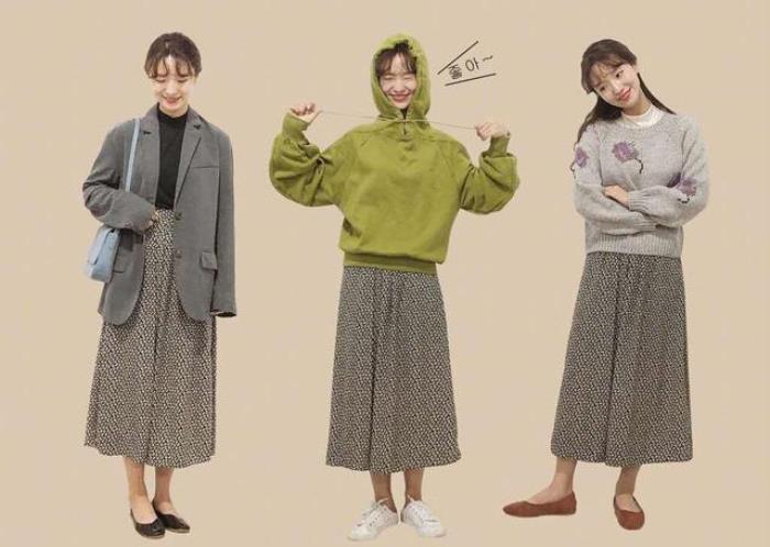 ↑这3套搭配是复古印花半裙的不同风格搭配,左边加一件西服和黑色小高领,穿出温婉女人味;中间配上卫衣活泼减龄俏皮;右边用灰色毛衣叠穿小高领,穿出优雅知性来。