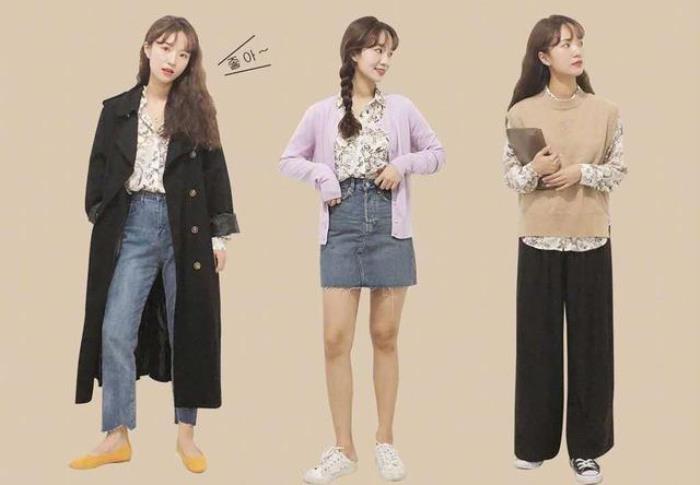 ↑代表着甜美的碎花衬衫更适合小个子。左边用黑色风衣和牛仔裤,再配上碎花衬衫穿出都市白领的随意潇洒;中间配一件淡紫色针织开衫,加一条牛仔半裙,穿出休闲和大长腿;右边用卡其针织背心叠穿碎花衬衫,再配一条阔腿裤,又飒又显高。